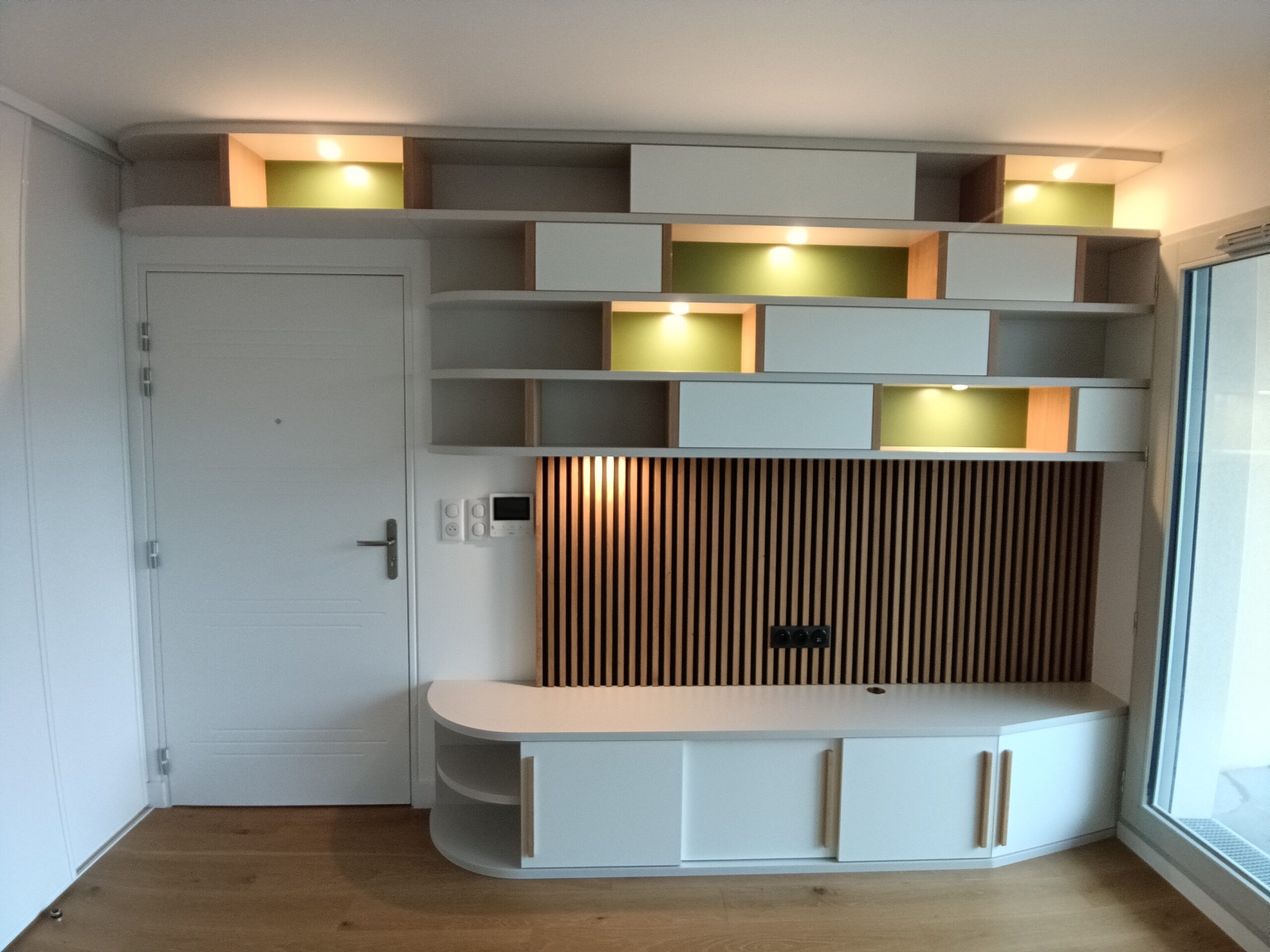 En collaboration avec Margot BOLIS (Designer architecte d’intérieur), j’ai réalisé cet agencement sur mesure. Meuble TV : Panneaux mélaminé de 30 mm, poignées bois fabrication maison, habillage mural en lattes de chêne verni…